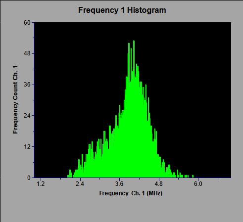 However, for this experiment, the user is expecting to have some variation from these values, and doesn’t want to go to that narrow BPF, in case there are velocities (frequencies) slightly outside this range for some of the datasets. For this reason, the bandpass was narrowed from 1-10 MHz, down to 0.3 – 3MHz. Then the downmix had to be adjusted from 36 MHz to 38.5 MHz. to get the data centered on this new frequency band.